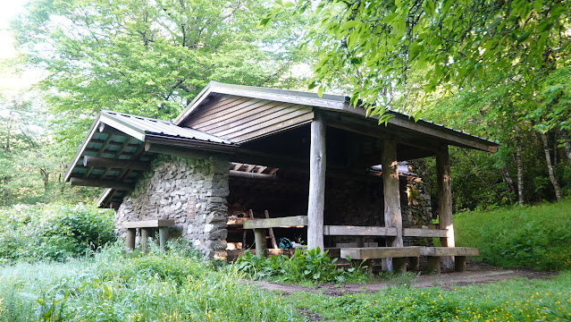 Na koniec dnia trafił mi się wysoko położony grzbiet, na którym rosły drzewa iglaste. Tak właśnie pamiętałam, że było na takich górach jak Clingmans Dome czy Roan Mountain. Cieszyłam się bardzo na wieczór, bo miałam spać w ostatniej na szlaku wiacie (jak zauważyliście nie było ich wiele). W Smoky Mountains wiaty są w zasadzie tylko na AT i wszystkie wyglądają tak jak ta jedyna na BMT: są kamienne, mają w bocznej ścianie kominek i piętrowe platformy do spania. Ta była fajna, bo jeszcze miała zadaszony stół piknikowy. Zjawiłam się pod wiatą już o 17. Poszłam od razu po wodę do źródła, trzeba było zejść kawał drogi. Była tabliczka z prośbą do tych, co podróżują konno, żeby nie prowadzili koni do źródła, tylko przynieśli sami wodę. Niestety jakieś barany dopiero co złamały zakaz i stroma ścieżka była rozwalona kopytami, a wokół źródła było pełno końskich odchodów. Niektórzy nie myślą... Jak tylko wróciłam do wiaty lunęło, i to jak! Burza która przechodziła cały wieczór była po prostu spektakularna, a ja wręcz wniebowzięta, że mogę ją podziwiać spod dachu. Nie ma nic lepszego w życiu hikera, moim zdaniem! Sączyłam herbatę, ssałam herbacianego cukierka, którego niosłam od początku podróży na specjalną okazję - było idealnie. I oczywiście nikogo innego nie było!