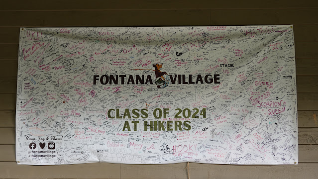 W Fontanie BMT znowu spotykał się z AT. To takie ikoniczne miejsce. Hikerzy docierają tam najczęściej po dwóch tygodniach wędrówki i jest to takie miejsce, w którym można już coś niecoś wnioskować, czy ma się szanse na ukończenie całego przejścia. Zapora Fontana jest jak kamień milowy, widać ją na każdym vlogu. Za nią zapał vloggerów zazwyczaj słabnie. Byłam oczywiście niezmiernie podekscytowana ponowną wizytą w tym miejscu. Z zazdrością czytałam imiona szlakowe tegorocznych hikerów na banerze przy publicznym WC. Przez jakiś czas ścieżka była wspólna. Zupełnie jej nie pamiętałam. Pamiętałam, że szłam nią też późno, o zmierzchu, byłam bardzo zmęczona, bo i dystans był długi i ilość przewyższeń. Warto było zasuwać, i wtedy, i teraz, bo w Fontanie znajduje się jedyna w swoim rodzaju wiata szlakowa, utrzymywana przez elektrownię. Ma przede wszystkim prawdziwą łazienkę z darmowym ciepłym prysznicem. Są też gniazdka USB i widok na jezioro.