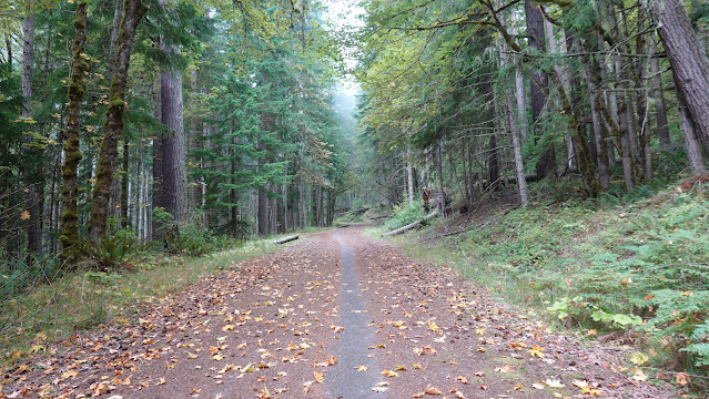 Na spotkaniu z Figiem wcale się nie skończyło. Kiedy w końcu poszłam zrobić zakupy spożywcze, pod sklepem spotkałam Pocky'ego i Seadoga! Mieli wypożyczony samochód i właśnie dali sobie spokój ze szlakiem. Nie dali rady zrobić trudnego szlaku alternatywnego, musieli zawrócić i tak byli już wszystkim zmęczeni, że stwierdzili, że już im się nie chce iść do końca. I tak za dużo ominęli, a w przyszłości chcą przejść PNT porządnie w całości. Wobec tego zapytałam czy nie mogliby mnie podrzucić z powrotem na szlak, na co chętnie przystali. Podrzucili mnie na kemping Bogachiel State Forest, gdzie był darmowy prysznic. Nie nocowałam tam, ale prysznic wzięłam. Zjadłam kurczaka przy stole piknikowym i dopiero potem, z mokrymi włosami, ruszyłam przejść jeszcze kilka km i zabiwakować byle gdzie w lesie. Zdjęcie niestety kompletnie nieostre, ale oddaje klimat.